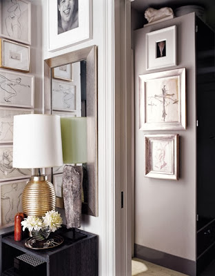 To many people it may be unthinkable to know that more people than they think forget about dressing the walls. They either get scared or intimidated by the thought of Gallery or salon walls or they just don't know to fill the space. I guess a simple rule of thumb is to get rid of the idea of perfection end result and any rule for that matter, and consider the conditions of the walls first of all. If it's in good condition maybe a good coat of paint or an elegant and simple paint technique before hanging one statement piece would be enough, as in Nicky Haslam Design in the top image, the walls are so beautifully done that a cluster of framed pictures would ruin the whole look. Beautiful objects such as big mirror, one big painting or an exotic textiles are also simple options. Of course a gallery wall is always a one step up if you decide to go for it. Enjoy!